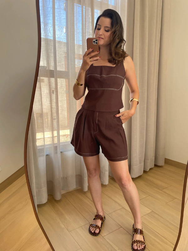 O Conjunto Ingrid é a alfaiataria reinterpretada de forma moderna e cheia de atitude. Confeccionado em tecido Sensoriale, ele traz uma proposta urbana e elegante que valoriza cada detalhe. O shorts tem caimento impecável com pregas estruturadas, pesponto contrastante, passantes para cinto, bolso faca funcional e fechamento por botão tingido na mesma cor da peça — um toque refinado que reforça a estética minimalista. A blusa, de alças largas e design clean, ganha personalidade com a costura pespontada e o fechamento por zíper destacável, que une praticidade e estilo em um único detalhe. É o conjunto que veste a mulher independente e sofisticada, que busca no look mais do que moda: uma declaração de força, estilo e urbanidade.